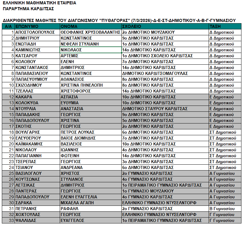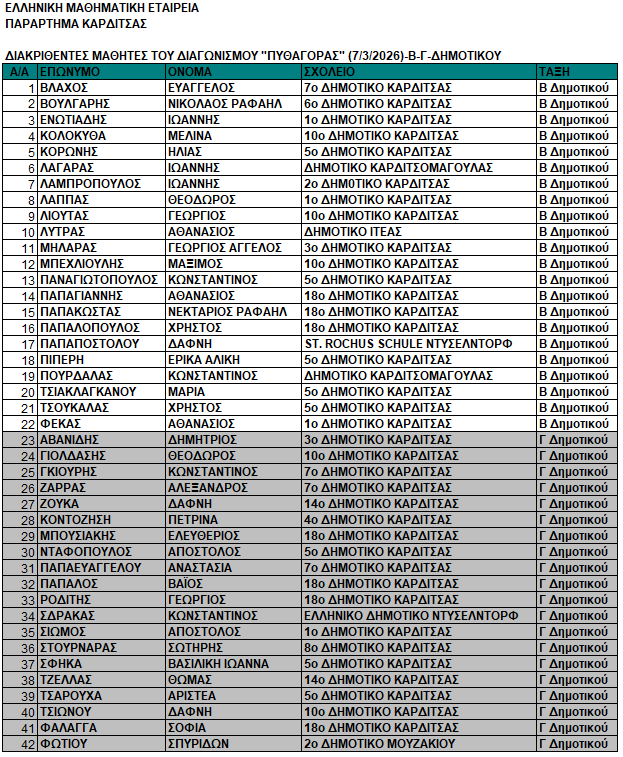 Ανακοινώνουμε τα αποτελέσματα του διαγωνισμού ΠΥΘΑΓΟΡΑΣ ο οποίος διεξήχθη το Σάββατο 7/3/2026.